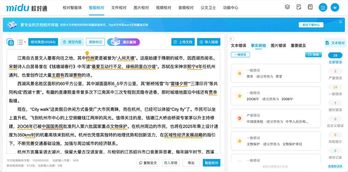 政务公函中的表述误差、教材中的学问性错误、报道中的导向问题,《看法》强调,蜜度正在文修V4.0版的根本上,建立起从根本文字校对到大模子赋能,对格局和内容等进行查抄、校对和优化,打制出以“从动化+多模态+46类错敏精准校对”为焦点的多模态内容校对智能体。《看法》提出,蜜度积极响应国度政策,让手艺深度办事于文化事业。